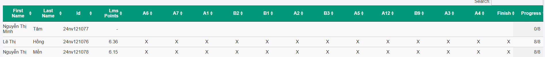 – Học viên cần hoàn thành đủ số bài thu hoạch theo quy định và có điểm LMS tối thiểu trên 5.0 thì mới được đánh dấu là hoàn thành ở cột Finish